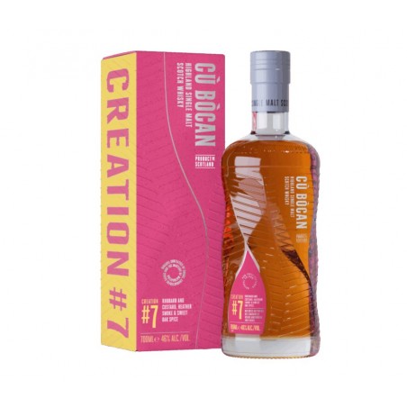 Cù Bòcan Creation #7 Single Malt est un whisky des Highlands audacieux et imaginatif qui met en valeur l'esprit expérimental de la distillerie grâce à une combinaison de fûts intrigante et un caractère légèrement tourbé. Élaboré à la distillerie Tomatin dans les Highlands écossaises, ce single malt en édition limitée est vieilli dans un assemblage de fûts de Pineau des Charentes Rouge et de fûts de chêne vierge, ce qui lui confère un profil aromatique unique, alliant douceur, épices et une subtile note fumée. Le Pineau des Charentes Rouge, vin fortifié de l'ouest de la France, apporte des arômes fruités éclatants et une richesse délicate, tandis que le chêne vierge lui confère profondeur et une chaleur épicée.