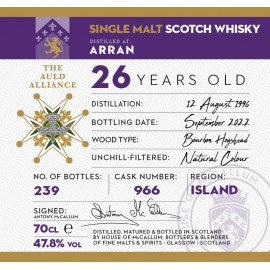 An Islay Single Malt with lots of character from the sea and grassy peat land. Amber wood and chimney lum after a peat fire . Pale from a second fill bourbon barrel in American Oak. For those who like an elegant peat, oily, seaweed and grassy.