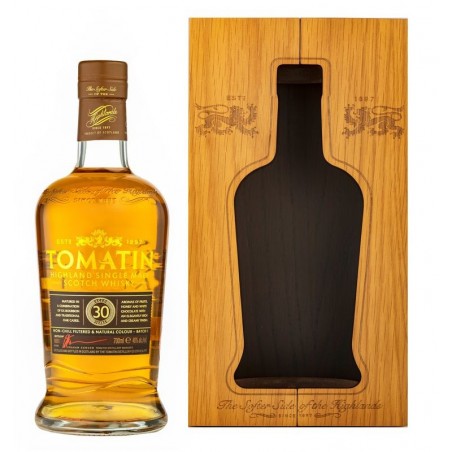The Tomatin 30-Year-Old is an exceptional single malt that embodies all the expertise of the renowned Highland distillery. Aged in small quantities in a combination of ex-bourbon oak casks and traditional oak casks, this whisky reaches remarkable maturity after three decades of patience. This masterpiece combines finesse and complexity, with a rich aromatic palette of fruits, creamy vanilla sweetness, and captivating spices. Awarded “World’s Best Design” at the World Whiskies Awards and a gold medal at the San Francisco World Spirits Competition 2019, it stands as a benchmark for discerning enthusiasts. This single malt is produced in a limited edition, with only 3,000 bottles available worldwide.