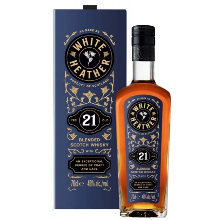 White Heather 21 ans est un blended Scotch whisky d'exception, élaboré sous la direction de Billy Walker, véritable légende de l'industrie avec plus de 50 ans d'expertise dans la création et l'assemblage de whiskies. Cette édition limitée rend hommage à la marque White Heather, relancée avec passion et soin en 2021. Ce whisky premium résulte d'une sélection rigoureuse des meilleurs single malts des régions du Speyside, des Highlands et d'Islay, associés à des whiskies de grain soigneusement choisis. Avec un processus de vieillissement méticuleux, incluant une maturation initiale de 18 ans dans des fûts de chêne américain et de sherry, suivie d’une seconde maturation de trois ans en fûts de Pedro Ximénez, d’Oloroso et de chêne vierge des Appalaches.