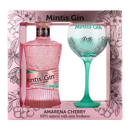 Ontdek de Mintis Amarena Cherry Gin in een elegante geschenkdoos, vergezeld van een glas, ideaal voor ginliefhebbers en degenen die van unieke fruitige smaken houden.